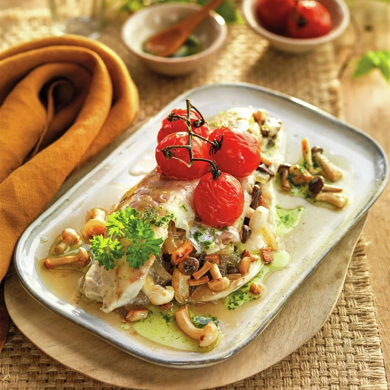 Запеченный морской окунь с грибами и помидорами черри Это восхитительный и неповторимый способ попробовать морского окуня, фаршированного грибами с помидорами черри и сбрызнутого маслом петрушки. ЭПростой и быстрый рецепт приготовления. Здоровье 50 029