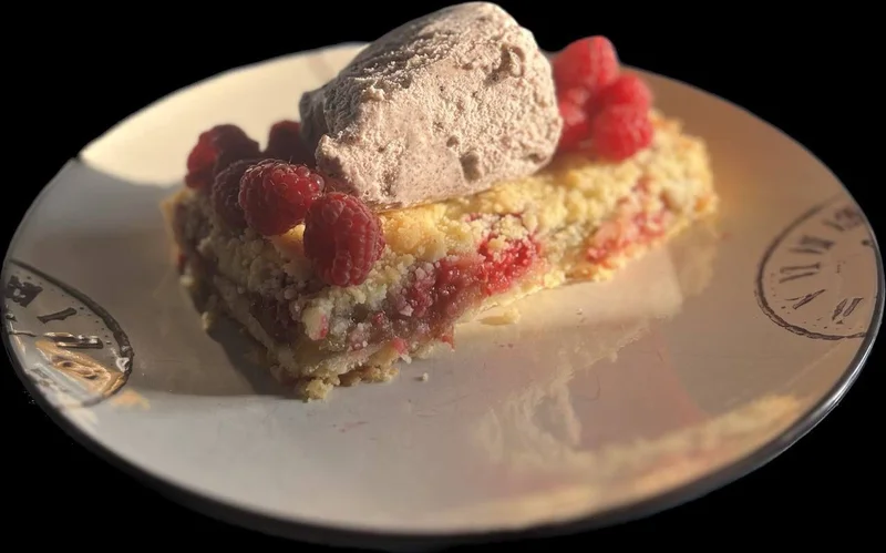 Мой десерт - фаворит — это песочный пирог с ревенем и малиной, и шариком итальянского джеллато.