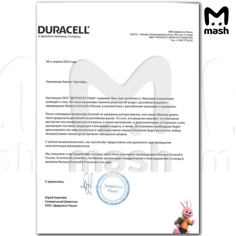 Ранее в Сети появился скан письма с подписью Юрия Коротаева о решении компании Duracell свернуть деятельность в РФ.