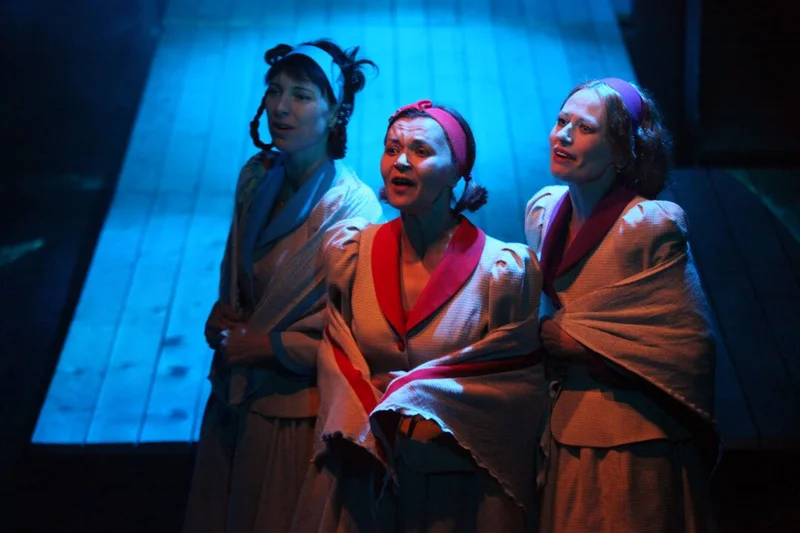 Зрителей погружают в действо ещё до заветных трёх звонков. В зрительном зале — тёплый запах дерева (настил планшета сцены — деревянный, да и минималистичные декорации — голубятня, лестница — тоже), слышны крики петуха и робкое чириканье пташек. Потому и не возникает удивление, когда спектакль начинается протяжной народной песней. Девичий хор (Татьяна Городецкая, Елена Шестовская, Илона Барышева) наполняет пространство чистыми, мощными голосами и плавными движениями, а вот главные герои спектакля двигаются и перемещаются отрывисто, нервно. Вся их жизнь — спешка, обилие домашних дел и нелёгкий труд. И хор, периодически разбавляющий эту стремительность своей напевностью и плавностью (звучат и народные песни, и частушки), уравновешивает темпоритм спектакля.