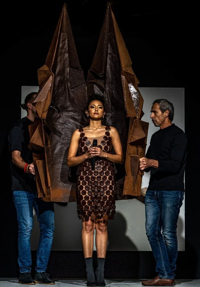 Другие участники Салона объединились для показа шоколадных платьев, сделанных в натуральную величину и надетых профессиональными моделями. Одна из них, «Мисс Франция 2020» Клеманс Ботино рассказала об ощущениях. «Вы должны быть по-настоящему одеты, обшиты, и всё время стоять прямо. А это довольно тяжёлый костюм и надо уметь носить его. Больше нет никакого секрета», - отметила манекенщица.