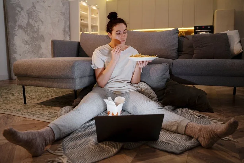 Девушка ест за ноутбуком Источник фото: @freepik/freepik.com