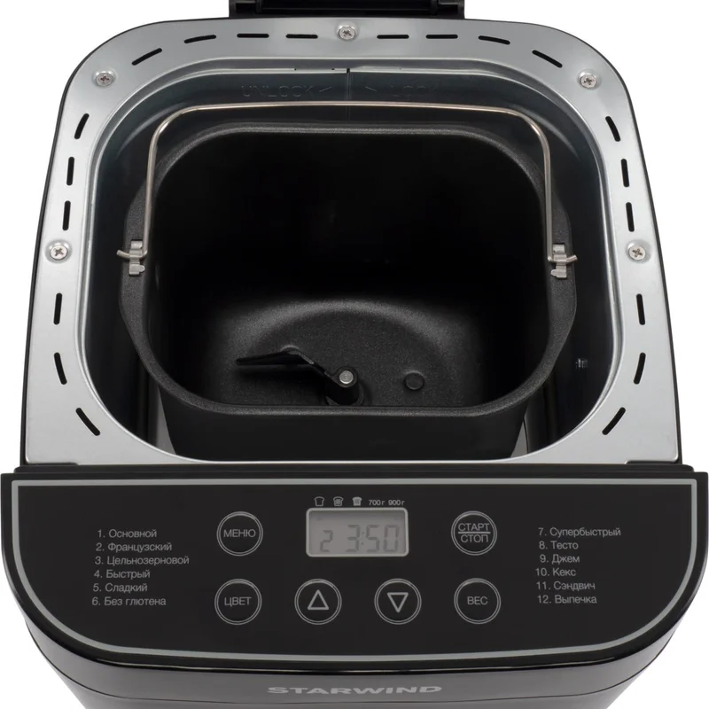 - Функции:выбор цвета корочки, поддержание температуры, регулировка веса выпечки, таймер отсрочки старта