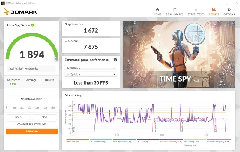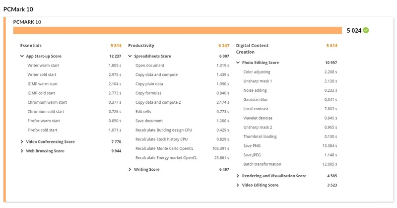 3DMark Time Spy показал суммарный результат в 1894 балла, оценив графику в 1672 пункта и процессор в 7675. PCMark 10 оценил сборку в 5024 балла и показал, что браузер на ноутбуке запускается менее чем за секунду, открытие вордовского документа занимает всего 1.3 секунды, а запуск GIMP - 2.1 секунды.