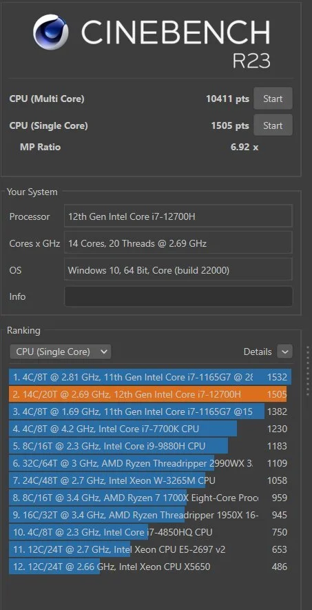 - Процессор — Соге i7-12700H (10 нм, 6+8 ядер/20 потоков, 2,7/4,7 ГГц, 45/115 Вт);