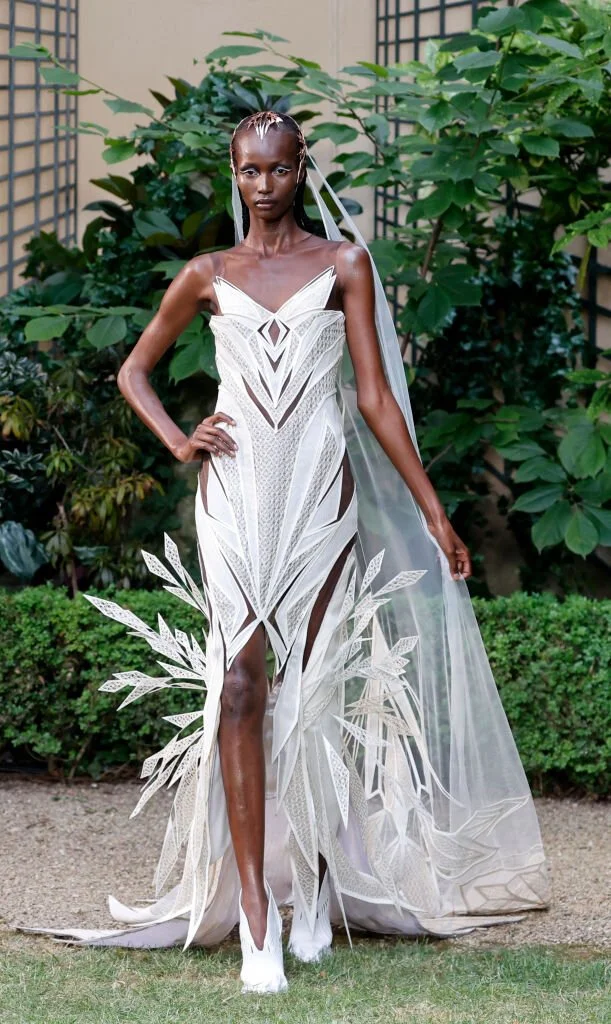 Французский модельер черпал вдохновение при создании свадебного наряда в этом году также, как и Айрис ван Херпен, в архитектурных формах. Наряд напоминает о древнегреческих весталках, колоннах Парфенона, кариатидах и т.д. Смысловой ряд можно продолжать долго. Изюминкой стала выступающая из лифа деталь декора, которая грозит оставить невесту одну на празднике жизни. Окружающие могут легко за неё зацепиться. Хотя, вероятно, найдутся и те, кто этого ждёт, чтобы получить незабываемые впечатления.