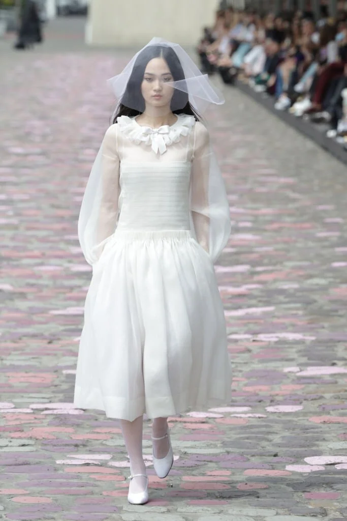 В этом году креативный директор Виржини Виар представила коллекцию haute couture, навеянную стилем французского пригорода. Под стать получилось у неё и свадебное платье – сочетание кокетливости и чистоты, выраженное в маленьком воротнике из рюшей с бантиком, пышных полупрозрачных рукавах, лифе-оригами и складчатой юбке. Милый образ дополнили винтажная фата, колготки и туфельки mary jane.