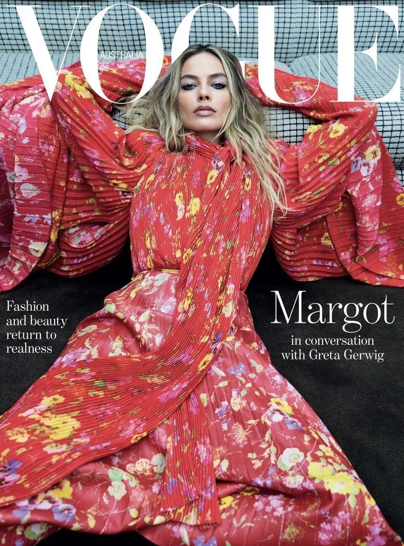 Снимки Марго Робби для журнала Vogue Australia сделал известный итальянский фотограф Марио Сорренти, стилистику разработала Кристин Сентенера. Для обложки актриса позирует в объёмных красных блузке и юбке от Balenciaga в цветочный принт. Особенным наряд делают широкие плиссированные рукава и шарф, обмотанный вокруг шеи.