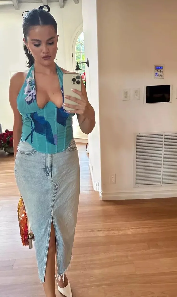 Эксперты советуют воспринимать юбку миди из денима как пару надёжных джинсов, но в более женственном варианте. Как и старые добрые синие брюки, такая юбка как у Гомес может и должна стать центральным элементом летне-осеннего гардероба по той простой причине, что она универсальна. Её, действительно, можно сочетать со всем, что есть в шкафу. Можно начать с юбки в качестве основы и двигаться дальше в составлении образа. Если хочется чего-то повседневного, подойдут классическая белая футболка и кроссовки. А если душа просит чего-то дерзкого и сексуального, берите пример с Селены и наденьте корсет с глубоким вырезом и туфли на каблуках.