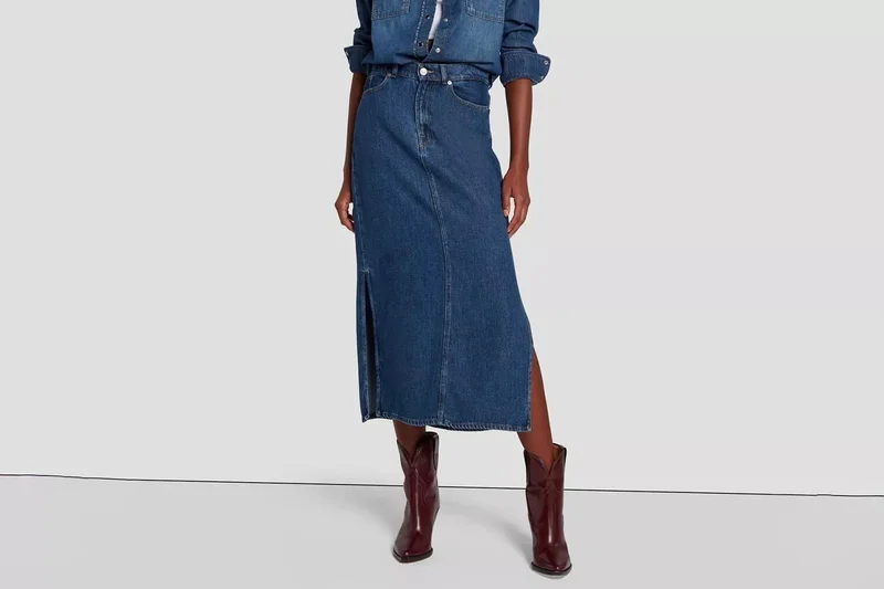 Пример осеннего образа с джинсовой юбкой миди Источник фото: 7forallmankind.eu