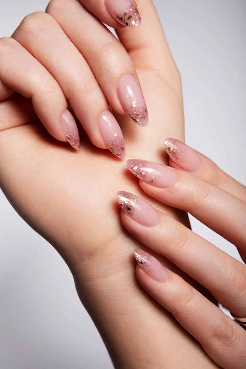Да, в умеренном количестве блёстки допустимы на ногтях деловой леди (и при условии, что основное покрытие всё же нейтральное и/или полупрозрачное).