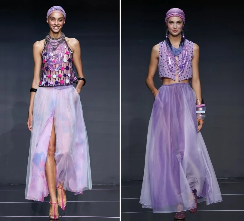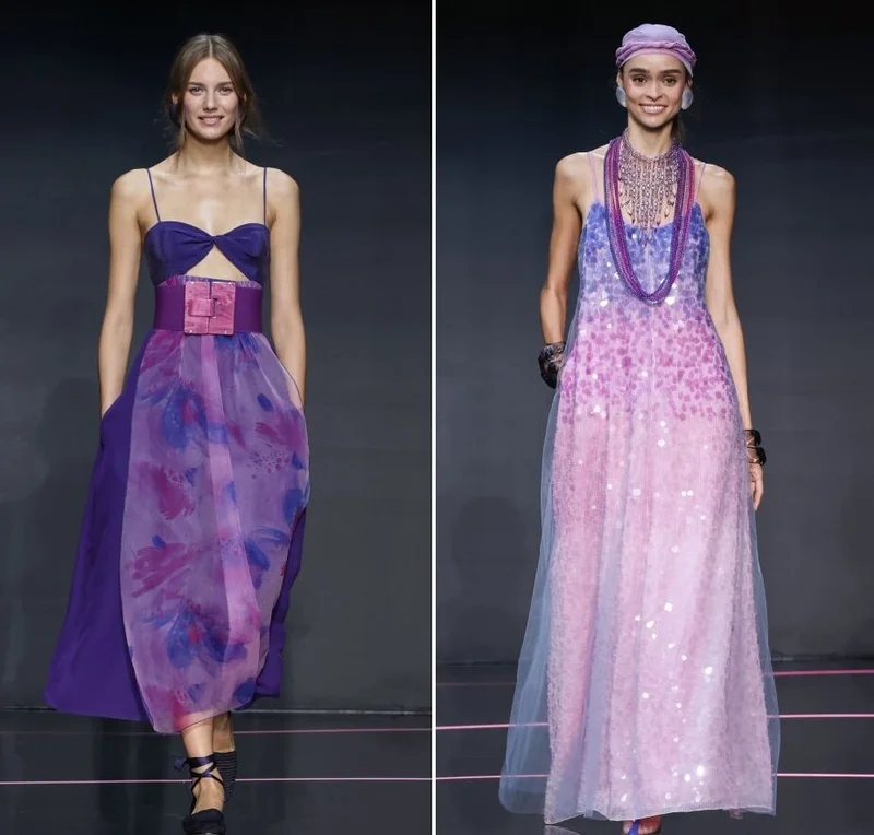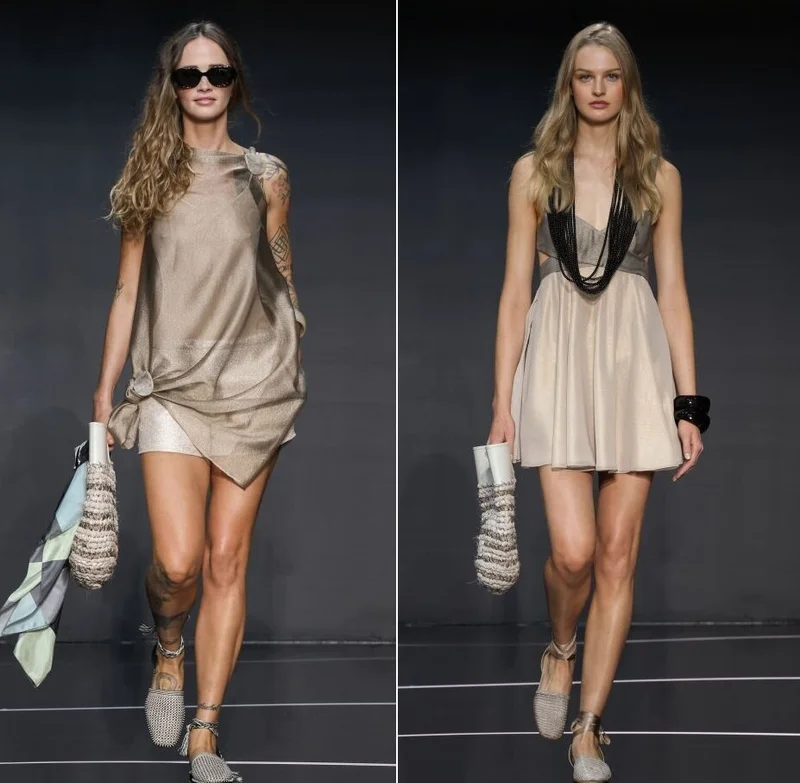 Поблёскивающие и прозрачные ткани, слоями нисходящие на шорты, топы халтеры и кникерсы, в избытке фигурировали на подиумах этой Недели моды в Милане. Армани тоже не стал пренебрегать подобным «раскладом». Он выпустил манекенщиц в коротких, на бретелях – или без бретелей – платьях фиолетового или мятного цветов, сочетающихся с обувью на плоской подошве.