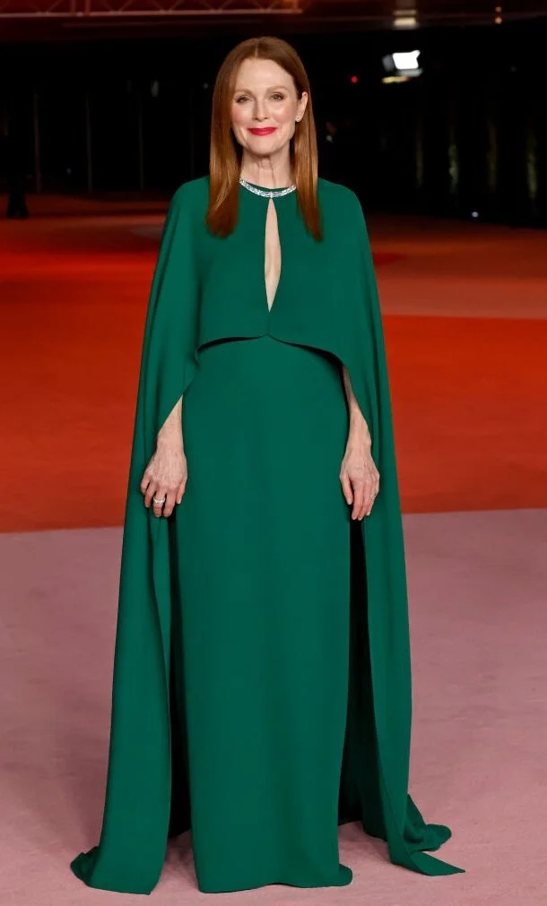 Партнёрша Натали Портман по фильму «Май декабрь» отметила на вечере Academy Museum Gala 2023 свой 63-й день рождения. По этому случаю Джулианна надела «королевское» платье-кейп насыщенного зелёного цвета, прекрасно оттенявшего её рыжие волосы, которые были уложены в стиле минимализма. Скромная улыбка, нескромные бриллиантовые ожерелье и кольца довершили элегантный образ.