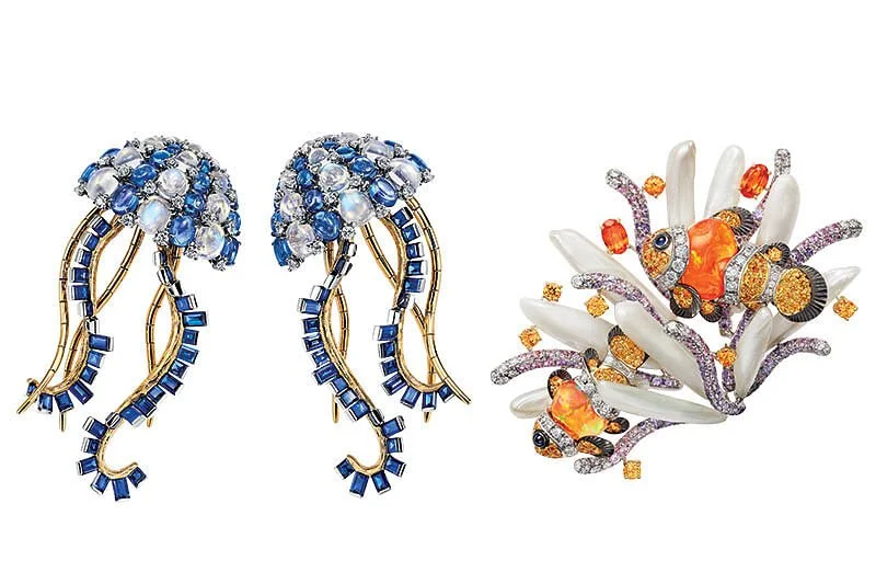 Тема фауны, похоже, не уйдёт в ближайшее время. Изменился лишь курс, как в случае с опалом, он взят на погружение в морские пучины. А там, чего только нет! Анемоны, морские звёзды и медузы – то, что с удовольствием использует в своих дизайнах Tiffany & Co. Кораллы – ещё одно «органическое» вдохновение, которые можно увидеть в коллекции Mikimoto «Praise to the Sea». Яркие серьги в виде кораллов или усыпанная драгоценными камнями рыба, выглядывающая из растений на брошке и словно навеянная морской фантазией.