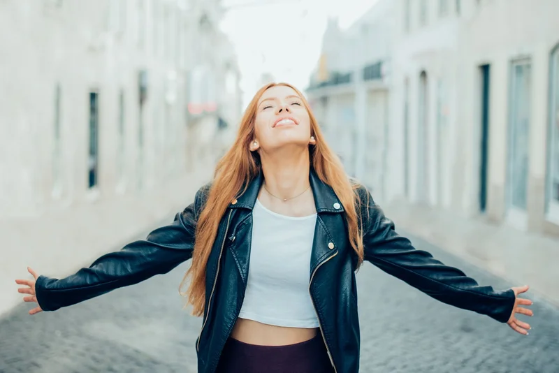 Счастливая девушка наслаждается прогулкой по городу. Источник фото: 123rf.com