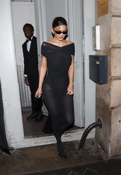 23-го января Дженнер заметили выходящей из парижского ресторана Siena. Это не был показ, но в воздухе витала атмосфера подиума. Перед фотографами Кайли возникла в чёрном облегающем платье, по типу большого куска полупрозрачной материи, обернувшем фигуру. Открытые плечи и длина миди, в принципе, не были чем-то выдающимися, гораздо интереснее было надетое под платьем – чёрное боди и плотные колготки. Таким образом, основательница бренда Khy мастерски продемонстрировала образ в стиле «без штанов», который ранее популяризировала её сестра Кендалл.