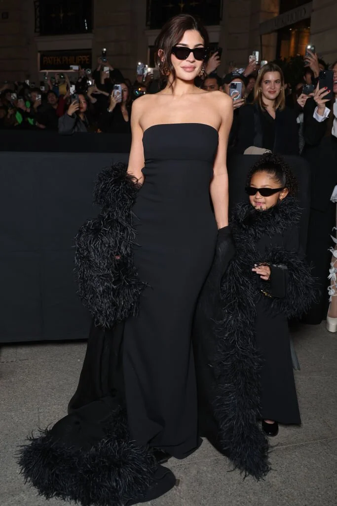 Всего лишь несколько часов спустя и Дженнер уже посещает шоу Valentino в формате «плюс один» с дочерью Сторми Вебстер. Дуэт предпочёл одеться полностью в чёрное. Кайли появилась перед журналистами в наряде актуальной сейчас эстетики «жена мафиози» - платье-колонне и драматичном кейпе с перьями от итальянского бренда. Со своей стороны, Сторми была одета в платье с отделкой из перьев и таком же боа. На финальной вечеринке Valentino мать скинула кейп, а дочь боа, и все увидели их обувь – лодочки у первой и mary jane у второй. Дженнер также продемонстрировала объёмную сумку VLogo Moon, которая обещает стать хитом.