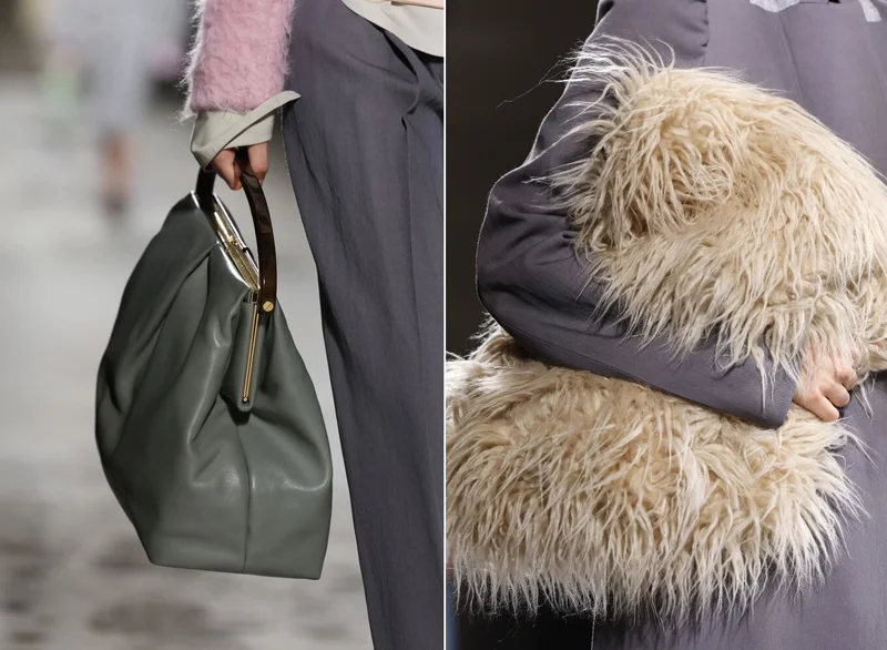 Креативный директор Chanel Виржини Виар озаботилась головными уборами и предлагает следующей осенью не выходить из дома без большой широкополой шляпы или объёмного кепи. Шляпы лучше всего носить по типу пиратских с поднятым впереди верхом и пристёгнутой к нему драгоценной брошью. Так вам точно не грозят атмосферные осадки, а ювелирное изделие подчеркнёт статус. Но не только украшаем голову чем-то объёмным, но и берём это самое объёмное в руки или вешаем на плечо. Valentino, Dries Van Noten, Stella MaCartney – все они предлагают большие сумки по типу мешков из кожи или меха.