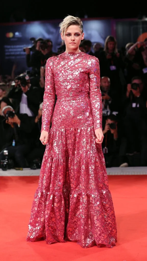 Для Венецианского кинофестиваля актриса сделала исключение и надела роскошное платье насыщенного ягодного цвета с блёстками. Но напоминанием о приверженности «острому» стилю послужила асимметричная причёска.