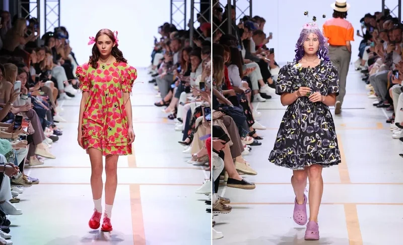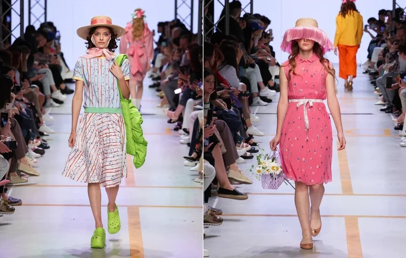 Коллекция противоположной направленности по сравнению с предыдущей. Искрящаяся и жизнерадостная, как мыльные пузыри на солнечном свете, пускаемые в детстве. Милые платьица с рукавами-фонариками и воланами, украшенные принтом из сердечек или пчёлок; широкие воротнички с рюшами на объёмных блузках; зелёные шорты в крупный горошек и розовый худи со стрекозой-вышивкой; резиновые сапожки с ленточками и полосатые сарафаны с фигурными подолом. Да, и не забыть перед выходом из дома шляпку-канотье или корзинку с цветами, а на ноги натянуть удобные кроксы или любимые кеды. Не коллекция, а мечта для всех «больших девочек», притаившихся в сердцах взрослых женщин.