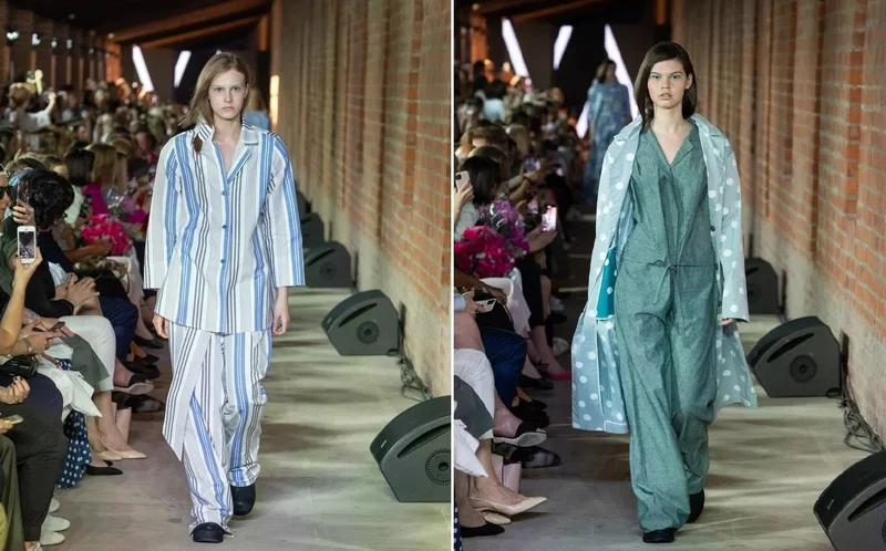 В качестве интересных деталей декора дизайнер использовала на плечевой линии моделей специальные петли, куда манекенщицы заправили свои длинные волосы. Мягкие пиджаки из льна Андреянова предложила носить с широким поясом, а на платьях те же самые пояса завязать пышным бантом.