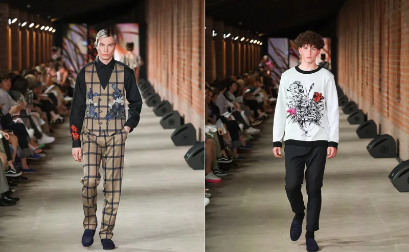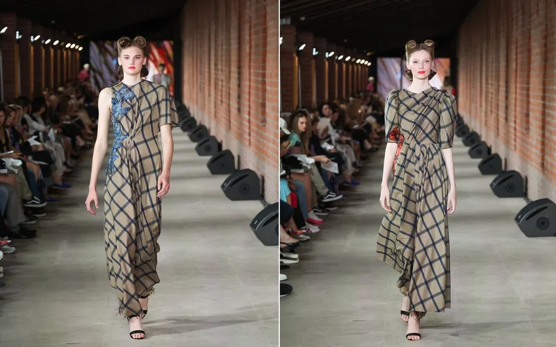 Растительная тема у Сысоева в этой коллекции господствующая. Причём, присутствует она не только в женских моделях, но и в мужских. Как интересно выглядит клетчатый жилет, на котором с двух сторон торс модели «обнимают» синие соцветья. Да, и ещё один цветок на рукаве рубашки. Если смотреть в целом на ансамбль, то, к удивлению, это не выглядит чрезмерным. Цветы на толстовках, жакетах, платьях и рубашках. В этом смысле на помощь художнику пришла такая ткань, как жаккард, придающая наряду благородство и изысканность.