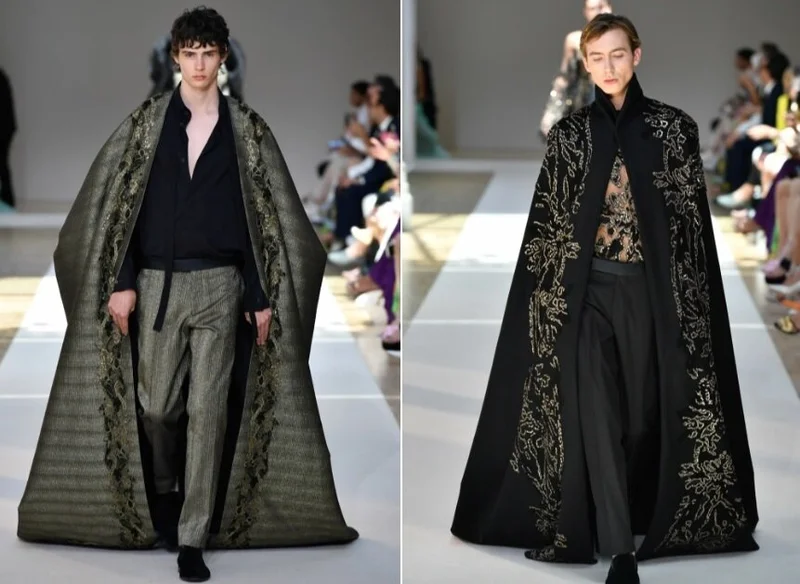 Ливанский бренд, специализирующийся на пошиве роскошных вечерних платьев для женщин, в этот раз обратил взор на сильную половину человечества. Мужчины на показе в Париже продефилировали в объёмных кейпах, украшенных перьями и бисером.