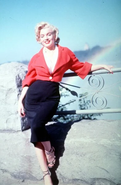 Повседневный образ Мэрилин Монро. По её фотографиям из внесценической жизни можно понять, что кинодива любила простые, но женственные, подчёркивающие силуэт вещи. Чёрная миди-юбка, босоножки в тон, белая блузка и яркий акцент в виде красного жакета — лаконично, но — согласитесь? — очень изящно.