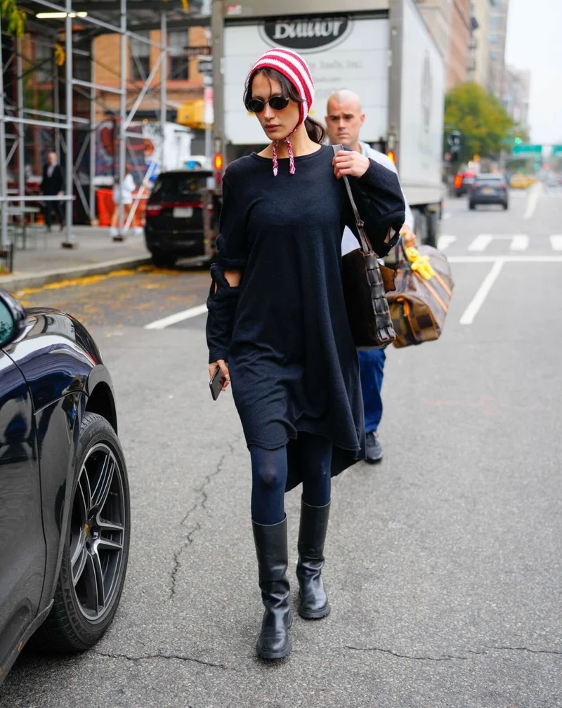 Красно-белый колпачок Хадид сделала центром своего лука, когда на днях прогулялась по Нью-Йорку. Надев тёплое трикотажное платье с фигурными вырезами на рукавах и дополнив его плотными колготками и объёмными сапогами, модель «разбавила» этот монохромный образ оригинальным головным убором. Чувствовала себя при этом Белла вполне комфортно, защитив уши от ветра, а волосы от укладки.