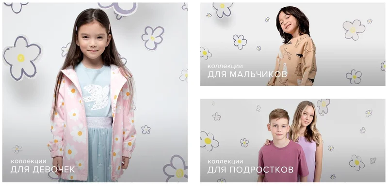 У этого бренда отдельно существуют коллекции для 3-х возрастных категорий: от 0 до 2-х лет, от 2-х до 7-ми лет и от 7-ми до 12-ти лет. Сделано это, чтобы учитывать особенности, присутствующих в каждой группе. Одежда первой категории характеризуется высоким качеством пошива и безопасностью, чтобы не навредить нежной коже малыша. Изделия следующей группы должны быть прочными и не стеснять движения, потому что в этом возрасте детишки начинают активно познавать мир. Для последней категории дизайнеры предпочитают использовать множество разных материалов, а также яркие и модные дизайны. Помимо представленных изделий для разных возрастов, бренд также выпускает одежду для разнообразного времяпрепровождения: занятий спортом, повседневные и праздничные варианты, пижамы.