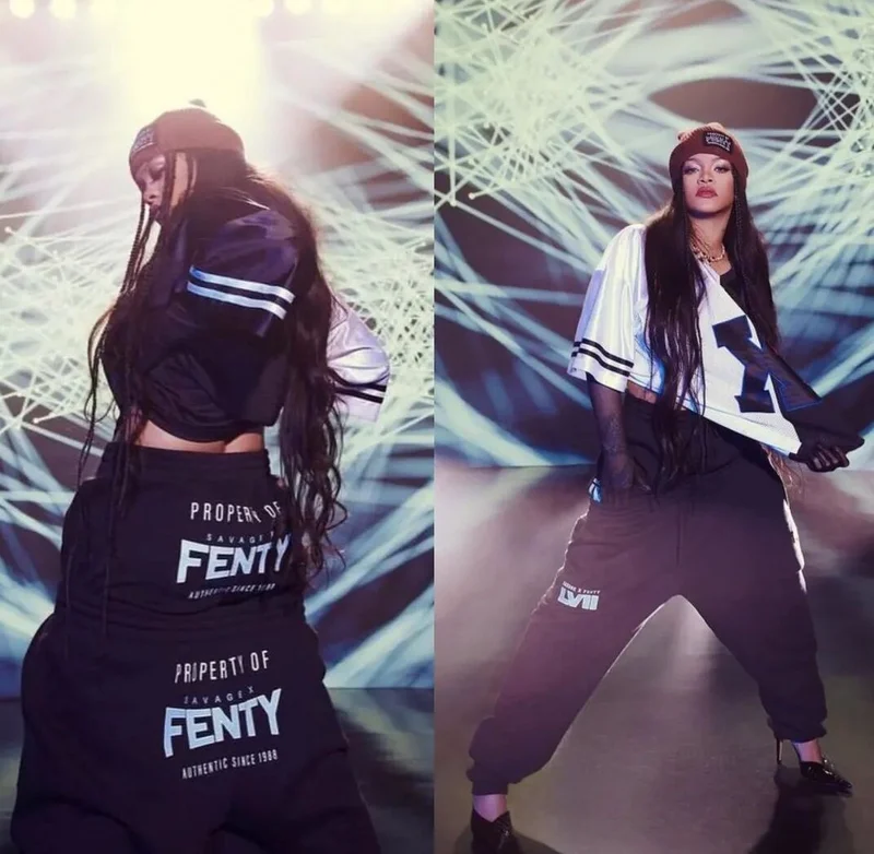 Их певица дополнила длинными чёрными перчатками, вязаной шапкой коричневого цвета и чёрными спортивными штанами с надписью: «Подлинная собственность Savage X Fenty с 1988 года" на задней стороне. «Мы слышали, там будет футбольный матч?», - шутливо прокомментировала Рианна свой пост.