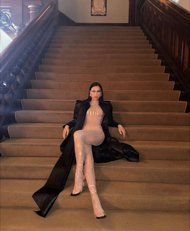 Топ-модель Ирина Шейк продолжает сотрудничать с модным домом Mugler и на свежих кадрах в своих социальных сетях предстала в полупрозрачном комбинезоне, который расшит множеством кристаллов.