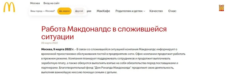 Сообщение компании "Макдональдс" о прекращении работы на территории России. Источник фото: скриншот с сайта "Макдональдса".