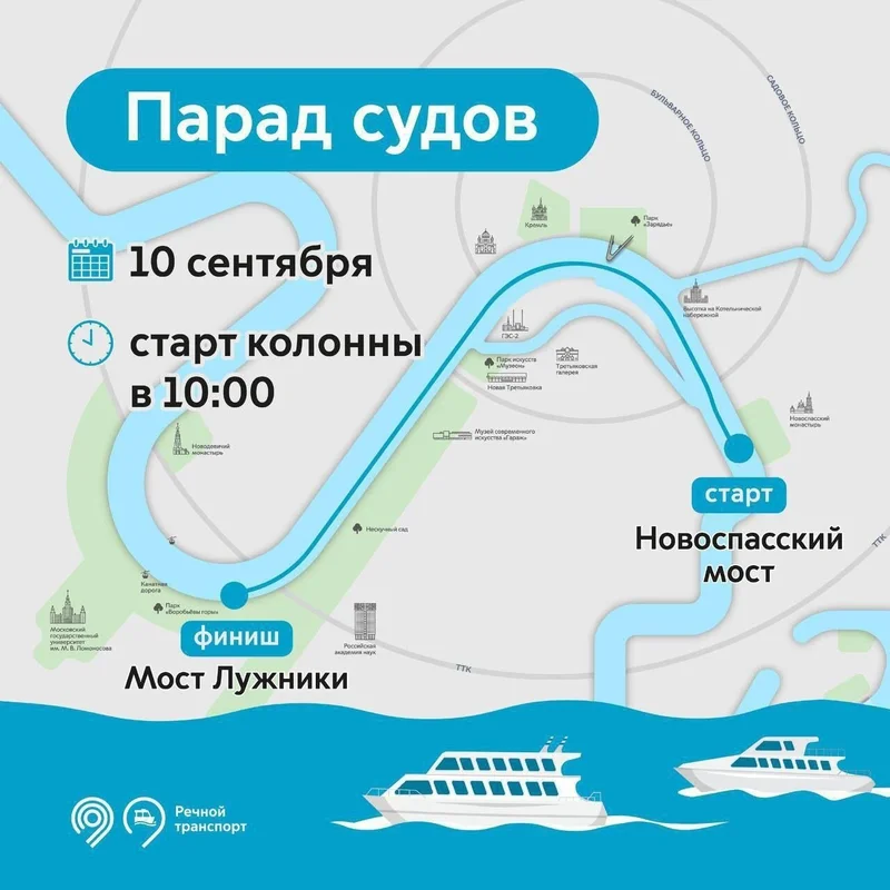 Колонна будет двигаться от Новоспасского моста через центр Москвы мимо парка Зарядье, Кремля, Храма Христа Спасителя и Парка Горького. Гостям предоставится возможность прокатиться на теплоходах. Старт колонны - в 10:00.