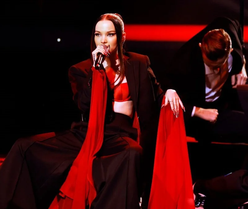 В ходе исполнения композиции «Crazy Angels» певица предпочла летать над зрительным залом на специальной конструкции и в костюме акробата. А на чёрной дорожке по прибытии блистала в платье от Tony Ward в пастельных оттенках.