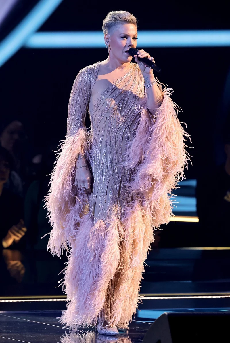 На сцене Пинк блистала в вечернем платье нежно-розового цвета с серебристой вышивкой и драматичными рукавами, отороченными страусиным мехом. А в начале вечера предстала перед фотографами в коротком блестящем платье с бахромой в стиле «гремящих 20-х» от Bob Mackie. Чуть позже к ней присоединились для позирования муж, мотогонщик Кэри Харт, и двое детей – 11-летняя Уллоу и 5-летний Джеймсон.