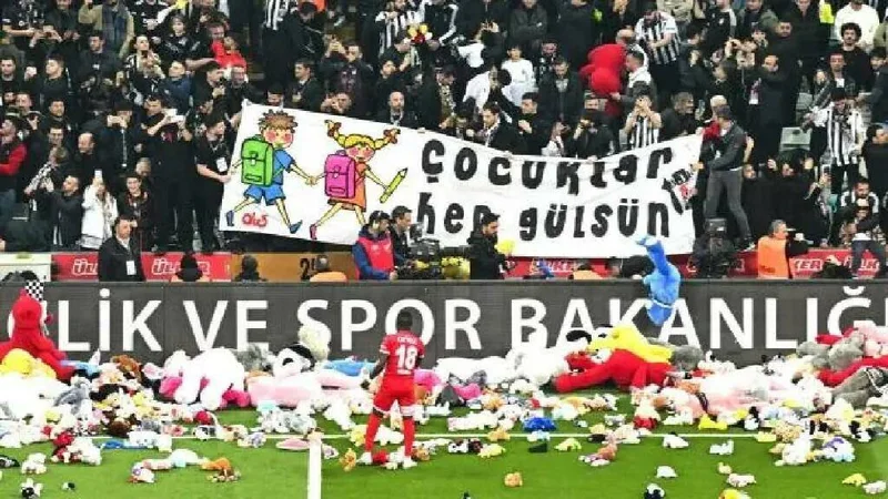 Сотни болельщиков бросили тысячи плюшевых мишек и других игрушек на игровую площадку во время матча между командами Бешикташ и Антальяспор в Стамбуле в качестве пожертвования детям, пострадавшим от землетрясения в Турции.