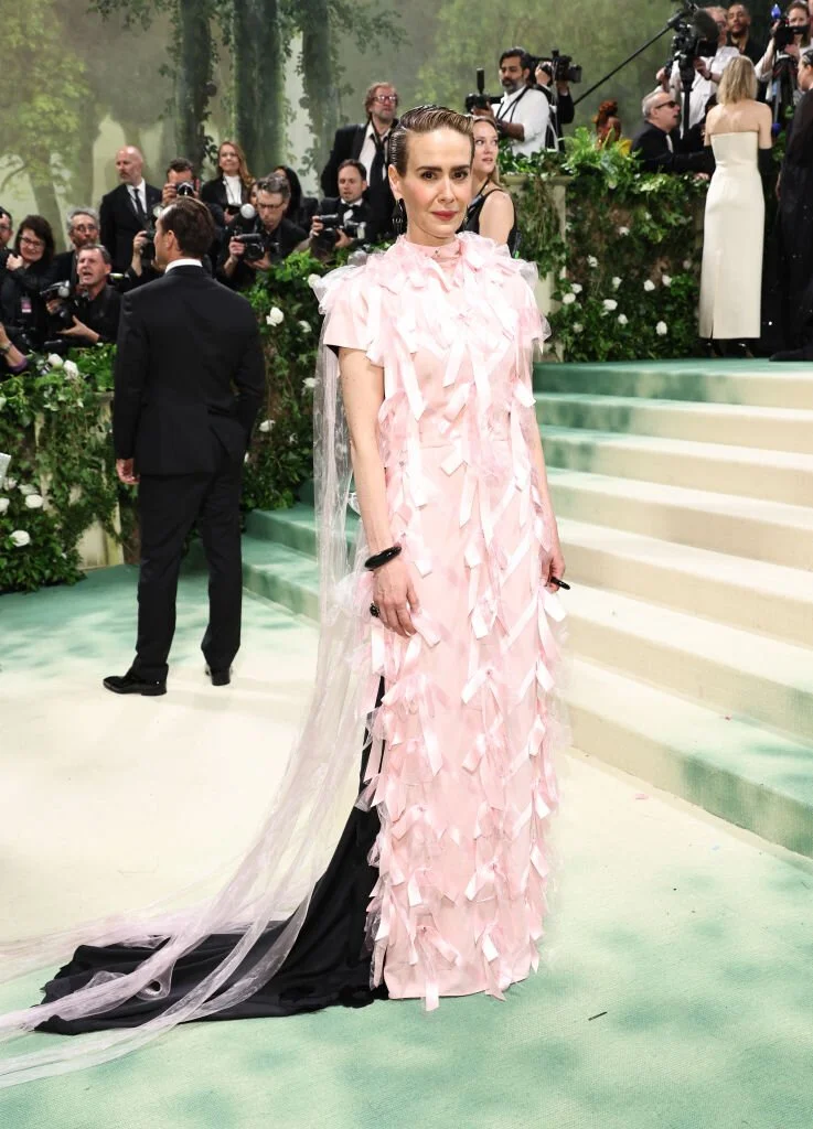Ну, и в заключение странный образ актрисы, славящейся хорошим вкусом и безошибочным выбором нарядов для красной дорожки. На Met Gala чувство прекрасного, по-видимому, изменило Саре, и она надела, или её уговорили это сделать, чёрно-розовое платье с бантиками из атласных ленточек. Причём, как оно сочеталось с темой «Сад времени» Полсон во время интервью так и не смогла объяснить.